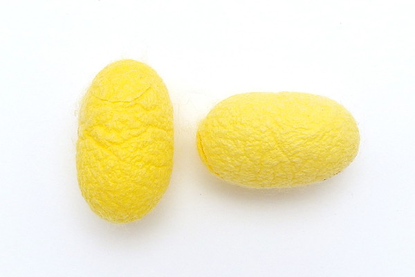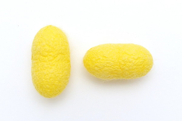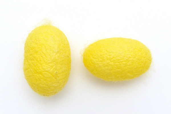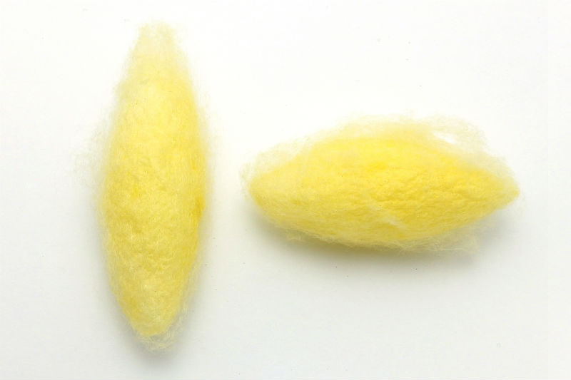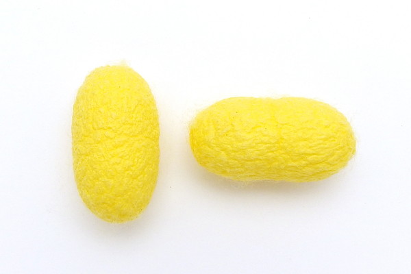 メスが黄色・オスが白色の繭を作る品種「限性黄繭」。人の手により改良され限性黄繭の特徴を持ちました。親の蚕(原蚕)も同じ特徴を持ちます。