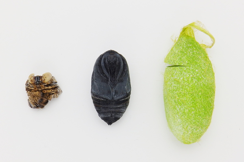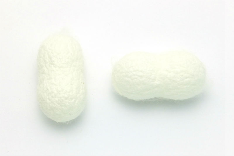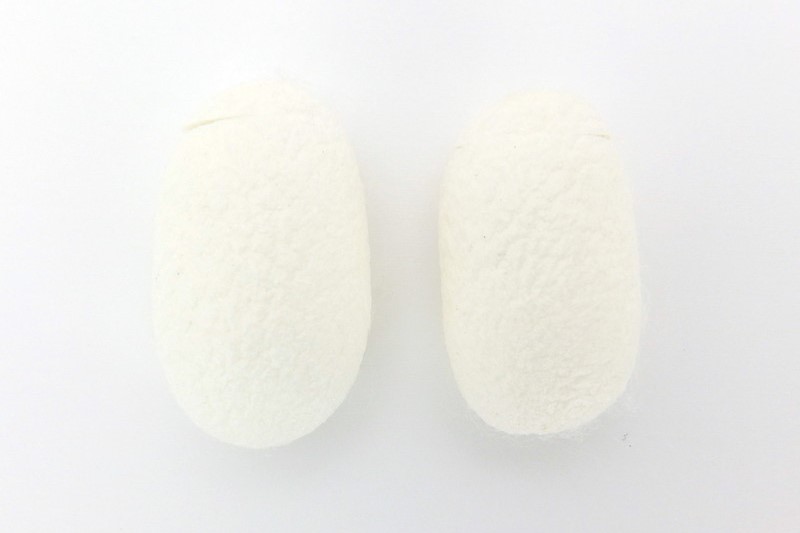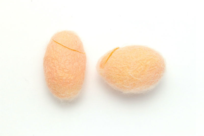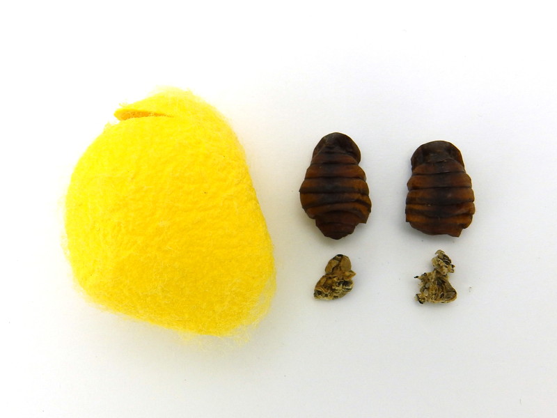 繭をカットして取り出した蛹、同じく繭の中にある熟蚕の抜け殻のセットです。