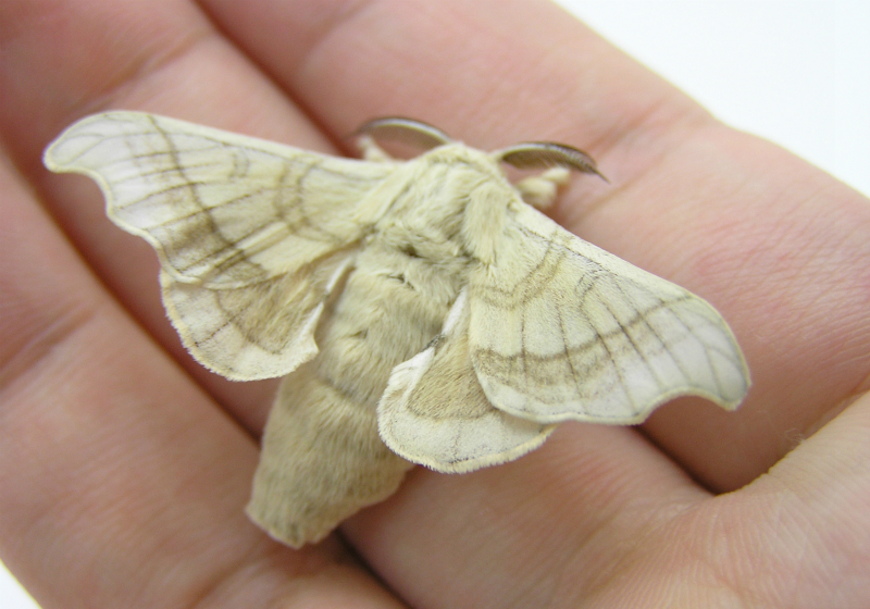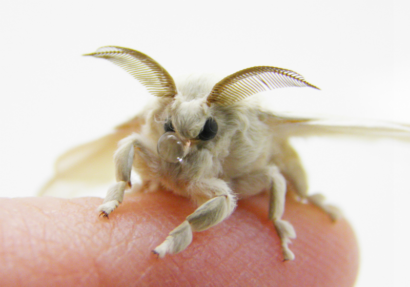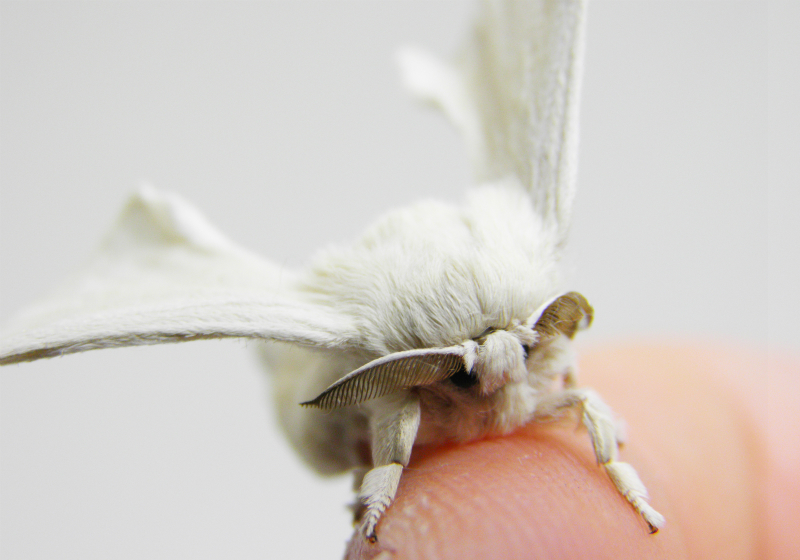 カイコの成虫はふわふわと柔らかい白い毛並みの麟粉に覆われていて、手に乗せて観察しても逃げたり、噛んだりしません。
