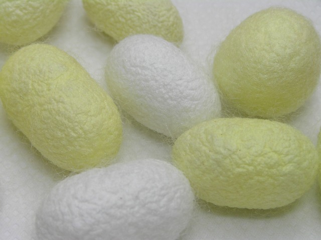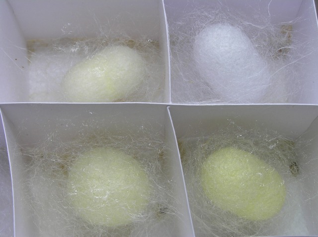 セットの品種は"黄白"、オスが白色・メスが黄色の繭を作る限性品種(限性黄繭)です。