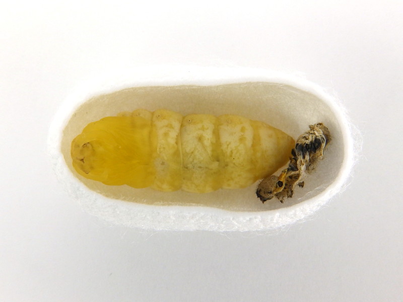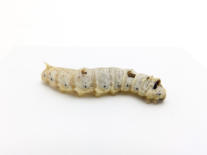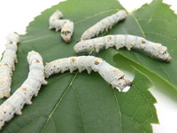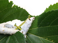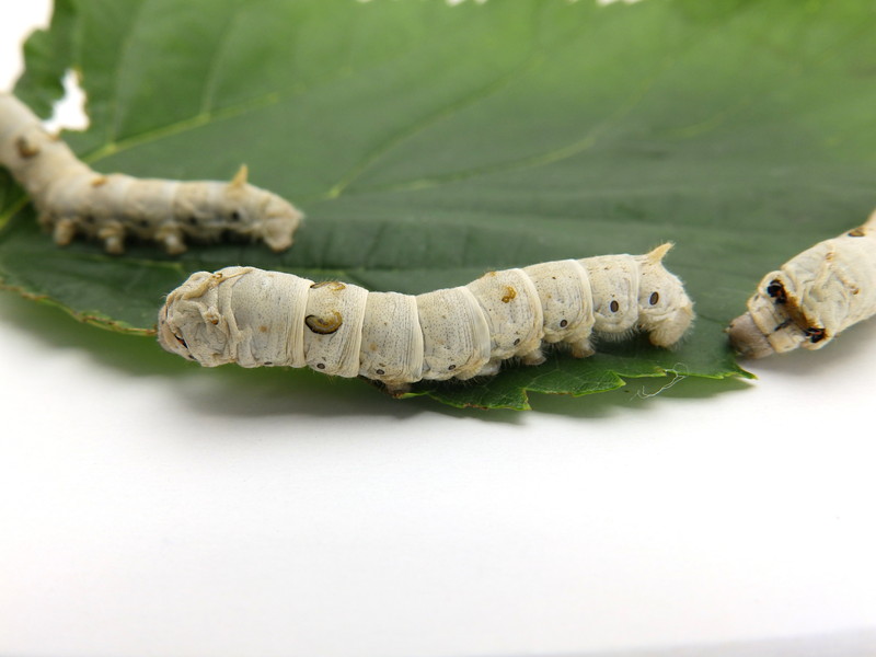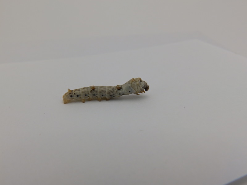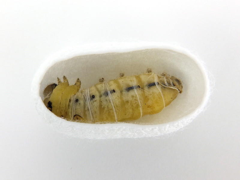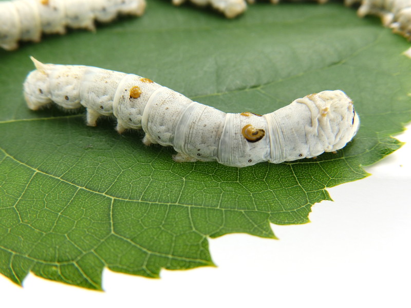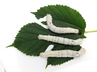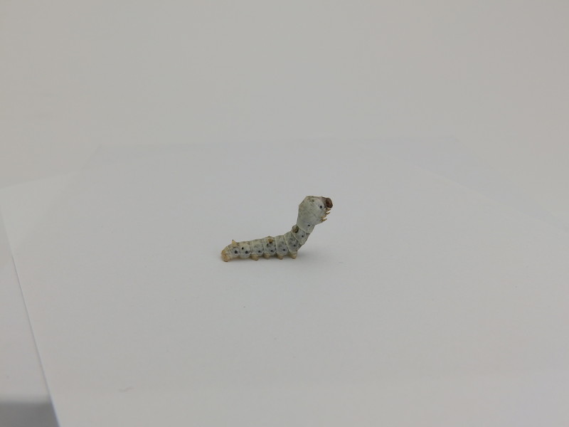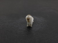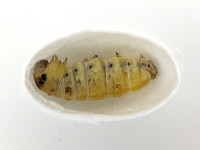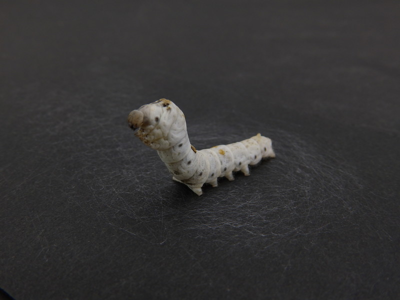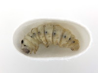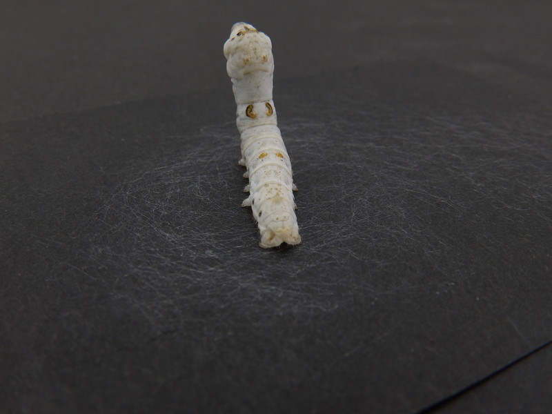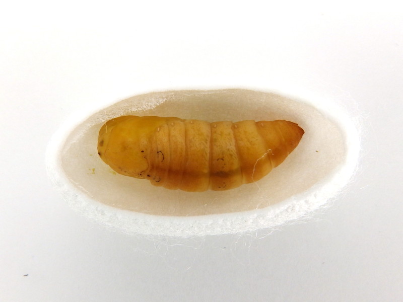 蚕(春麗×鍾月)の写真集 普通蚕(一般に生糸を生産する種類の蚕)『春麗×鍾月』の成長写真です。 令 写真 卵~孵化 1mm 鼠色をした卵(休眠卵)の孵化の様子です。 蚕は卵の殻を食い破るようにして卵から出てきます。 蚕が出て行った卵の殻は白っぽい色をしています。 1令の蚕は体全体が黒く、全体に毛が生えています。 蟻のように見えるため、蟻蚕(ぎさん)と呼ばれます。 1令 3日~4日間 2mm→5mm 1眠 約1日間 約5mm 蚕は脱皮の前に『眠』という状態になります。 約1日間、えさをとらずにじっとしていてやがて脱皮をし、次の令になります。 2令 3日~ 4日間 約6mm→ 12mm 2眠 約1日間 11mm 3令 3日~ 4日間 約13mm →24mm 3眠 約1日間 約23mm 4令 約5日間 体長24→ 44mm 4眠 約1日間 約41mm 蚕は脱皮の前に足元に糸を吐いて足元を固めます。 5令 6日~ 7日間 体長45→ 80mm 熟蚕~営繭~蛹化~蛹 16日 繭を作る直前の蚕(熟蚕)は少し体が縮んで足や体がやや黄色くなります。 繭の中で脱皮をし、蛹になります。 成虫 (蛾) 7日 (写真準備中) 蚕の学習に役立つページにて写真の蚕の多数の動画を公開しております。ご覧ください。 掲載写真をご利用になりたい場合はお問い合わせください。