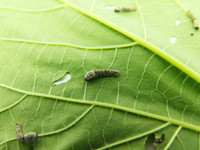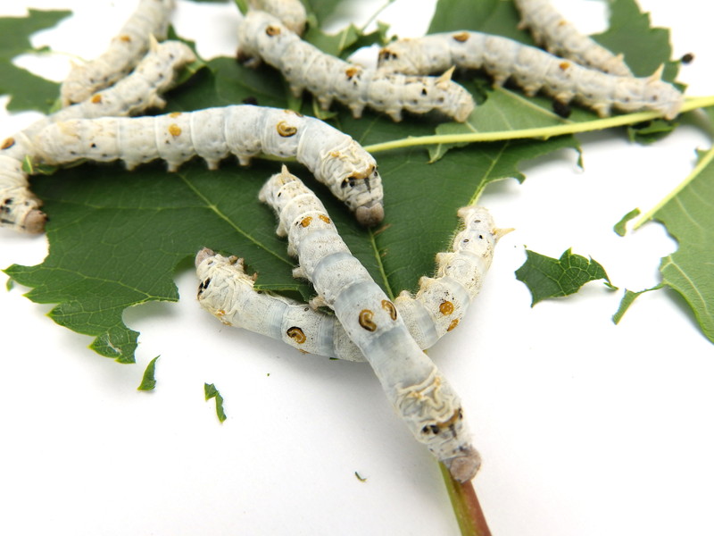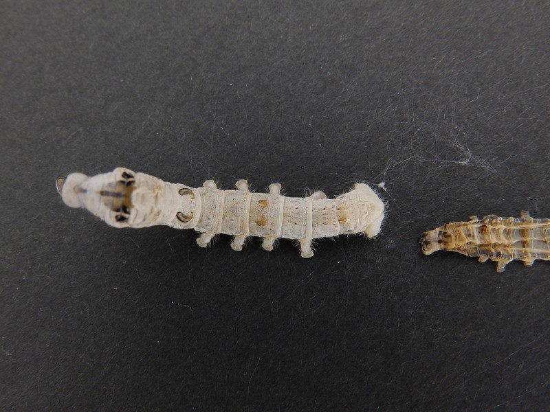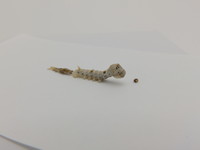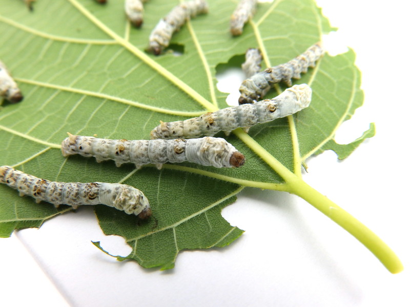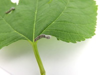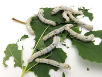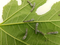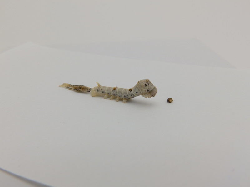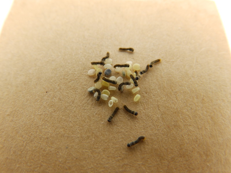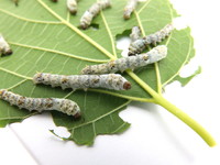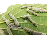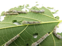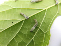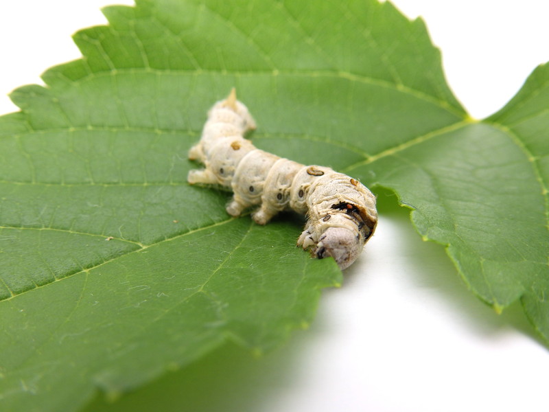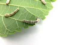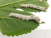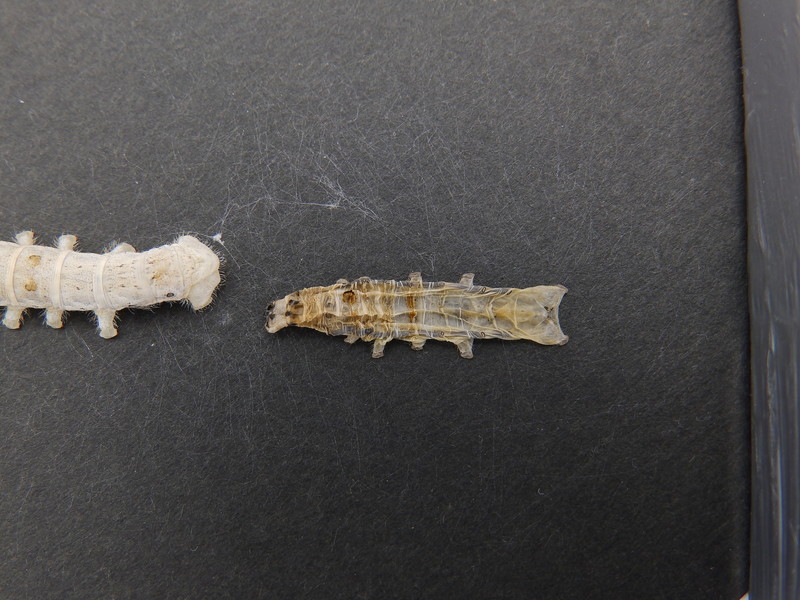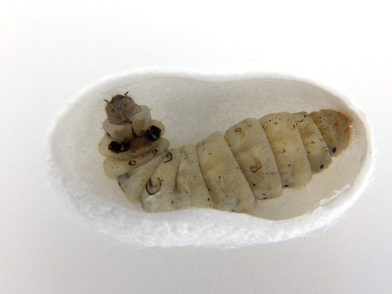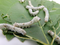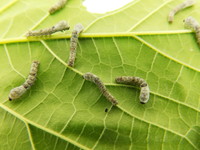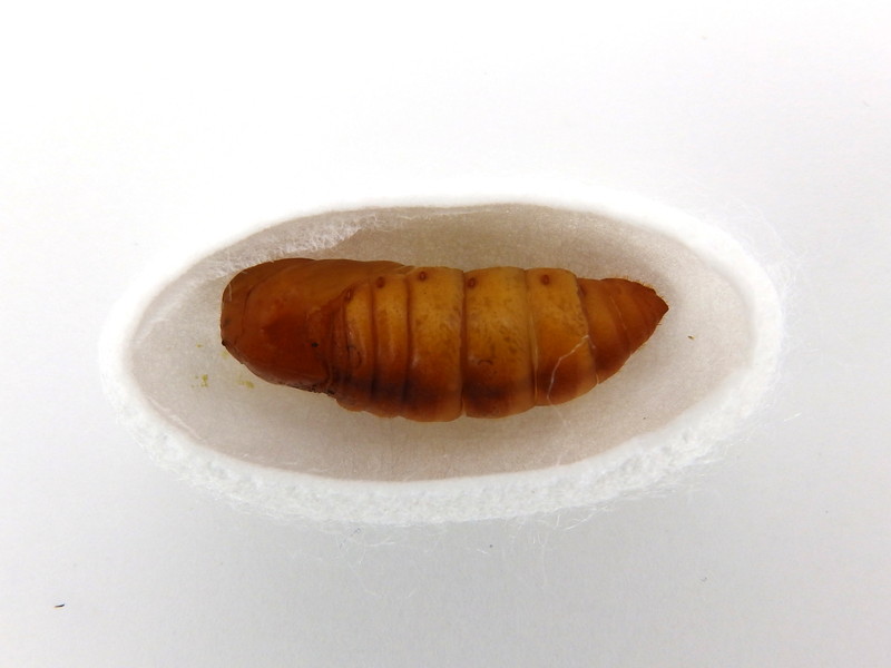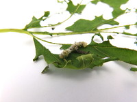 蚕(春麗×鍾月)の写真集 普通蚕(一般に生糸を生産する種類の蚕)『春麗×鍾月』の成長写真です。 令 写真 卵~孵化 1mm 鼠色をした卵(休眠卵)の孵化の様子です。 蚕は卵の殻を食い破るようにして卵から出てきます。 蚕が出て行った卵の殻は白っぽい色をしています。 1令の蚕は体全体が黒く、全体に毛が生えています。 蟻のように見えるため、蟻蚕(ぎさん)と呼ばれます。 1令 3日~4日間 2mm→5mm 1眠 約1日間 約5mm 蚕は脱皮の前に『眠』という状態になります。 約1日間、えさをとらずにじっとしていてやがて脱皮をし、次の令になります。 2令 3日~ 4日間 約6mm→ 12mm 2眠 約1日間 11mm 3令 3日~ 4日間 約13mm →24mm 3眠 約1日間 約23mm 4令 約5日間 体長24→ 44mm 4眠 約1日間 約41mm 蚕は脱皮の前に足元に糸を吐いて足元を固めます。 5令 6日~ 7日間 体長45→ 80mm 熟蚕~営繭~蛹化~蛹 16日 繭を作る直前の蚕(熟蚕)は少し体が縮んで足や体がやや黄色くなります。 繭の中で脱皮をし、蛹になります。 成虫 (蛾) 7日 (写真準備中) 蚕の学習に役立つページにて写真の蚕の多数の動画を公開しております。ご覧ください。 掲載写真をご利用になりたい場合はお問い合わせください。