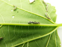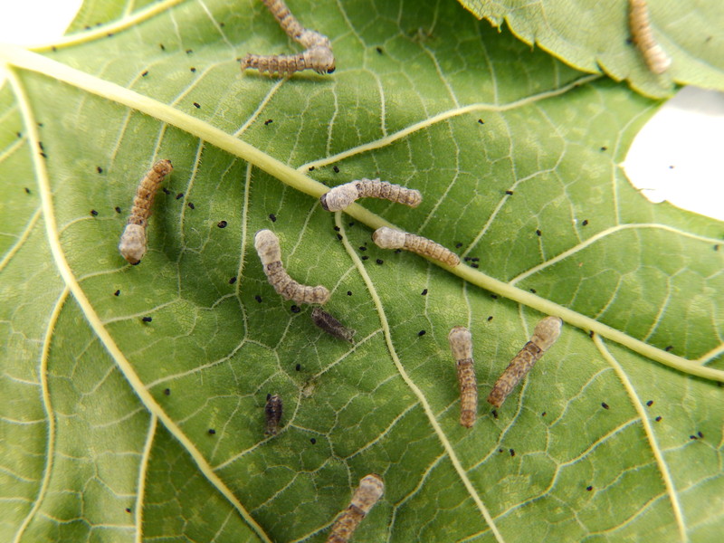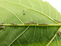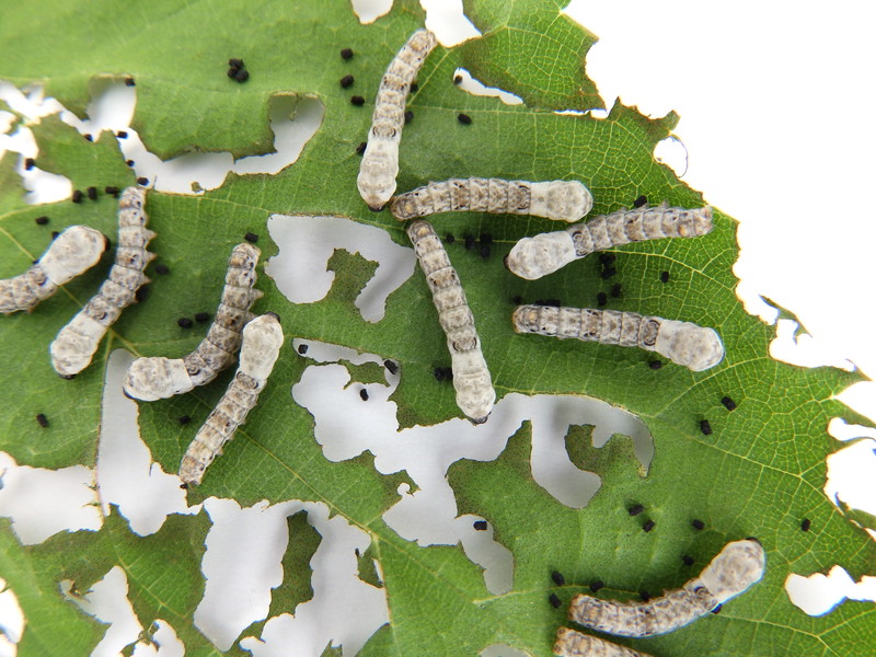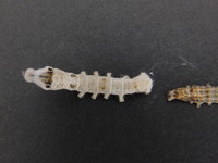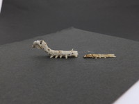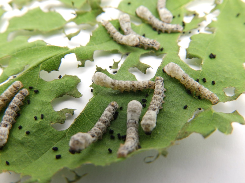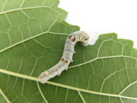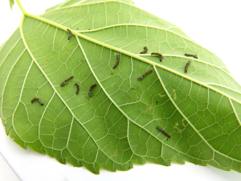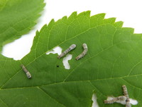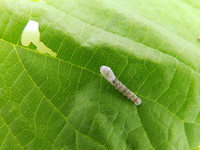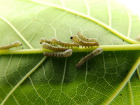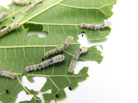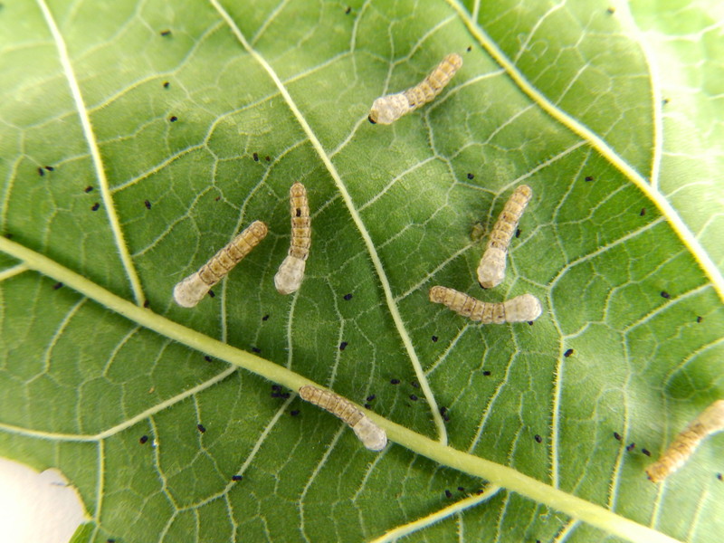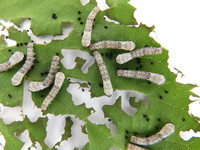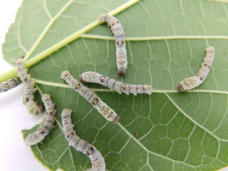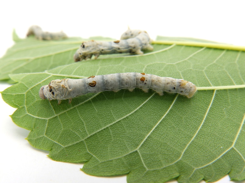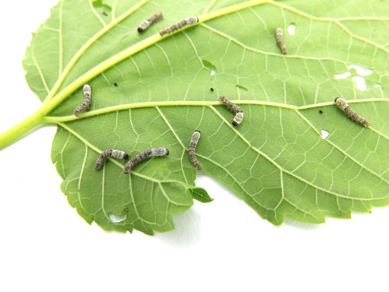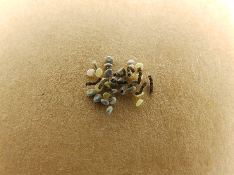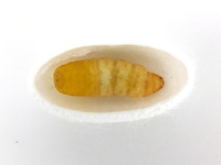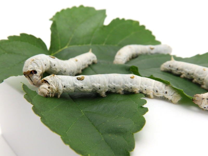 蚕(春麗×鍾月)の写真集 普通蚕(一般に生糸を生産する種類の蚕)『春麗×鍾月』の成長写真です。 令 写真 卵~孵化 1mm 鼠色をした卵(休眠卵)の孵化の様子です。 蚕は卵の殻を食い破るようにして卵から出てきます。 蚕が出て行った卵の殻は白っぽい色をしています。 1令の蚕は体全体が黒く、全体に毛が生えています。 蟻のように見えるため、蟻蚕(ぎさん)と呼ばれます。 1令 3日~4日間 2mm→5mm 1眠 約1日間 約5mm 蚕は脱皮の前に『眠』という状態になります。 約1日間、えさをとらずにじっとしていてやがて脱皮をし、次の令になります。 2令 3日~ 4日間 約6mm→ 12mm 2眠 約1日間 11mm 3令 3日~ 4日間 約13mm →24mm 3眠 約1日間 約23mm 4令 約5日間 体長24→ 44mm 4眠 約1日間 約41mm 蚕は脱皮の前に足元に糸を吐いて足元を固めます。 5令 6日~ 7日間 体長45→ 80mm 熟蚕~営繭~蛹化~蛹 16日 繭を作る直前の蚕(熟蚕)は少し体が縮んで足や体がやや黄色くなります。 繭の中で脱皮をし、蛹になります。 成虫 (蛾) 7日 (写真準備中) 蚕の学習に役立つページにて写真の蚕の多数の動画を公開しております。ご覧ください。 掲載写真をご利用になりたい場合はお問い合わせください。