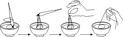 糸口を見つける口立箒(みごほうき)は割り箸か箒草で代用します。繭には、糸口を見つけるのが難しい繭がありますが、頑張って糸口を見つけて下さい。