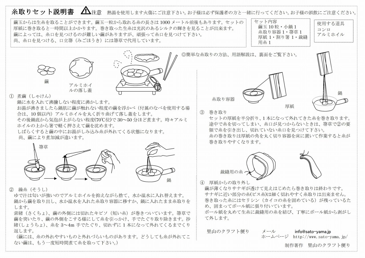 (繭には、糸の外れやすいものと外れづらいものがあります。どうしても糸が外れてこない繭は、もう一度短時間煮て糸を取って下さい。)
