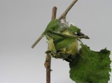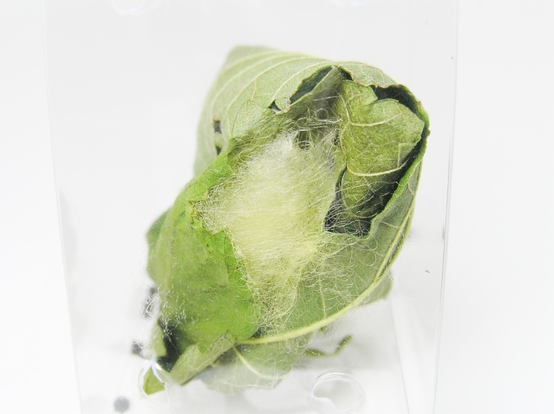 クワコは葉っぱを丸めて中に繭を作るようです。糸は、黄緑色のとてもきれいな色をしています。